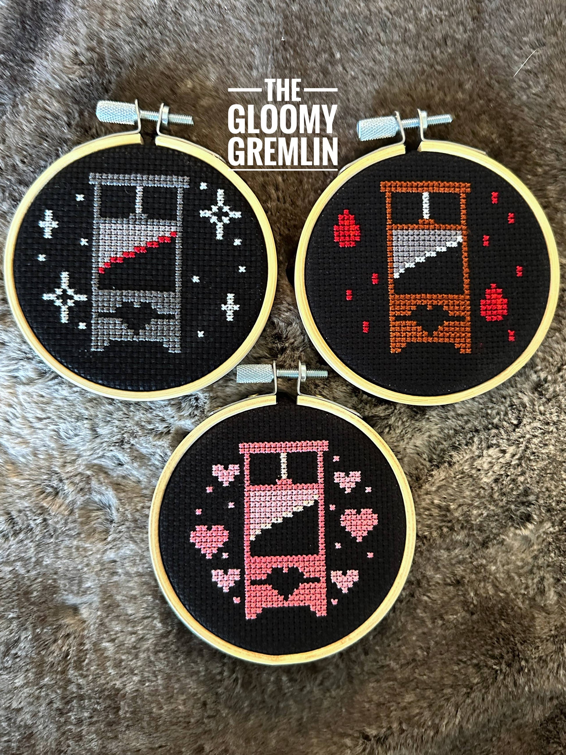Each kit comes packaged in a black or purple 6 x 9 envelope, and includes the full color cross stitch pattern, a beginner cross stitching guide, 14 count black Charles Craft aida fabric, DMC embroidery thread, an embroidery needle, and a 3" embroidery hoop.