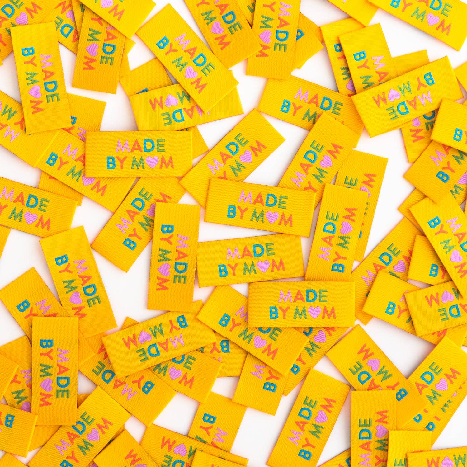 Made by mom! Finish all your baby, kids, quilt, and gift projects with these adorable woven labels. High quality, bright yellow woven labels feature coral, purple, blue and green text. They are soft to the touch and never scratchy. The labels are fully washable and can handle the heat of the dryer.